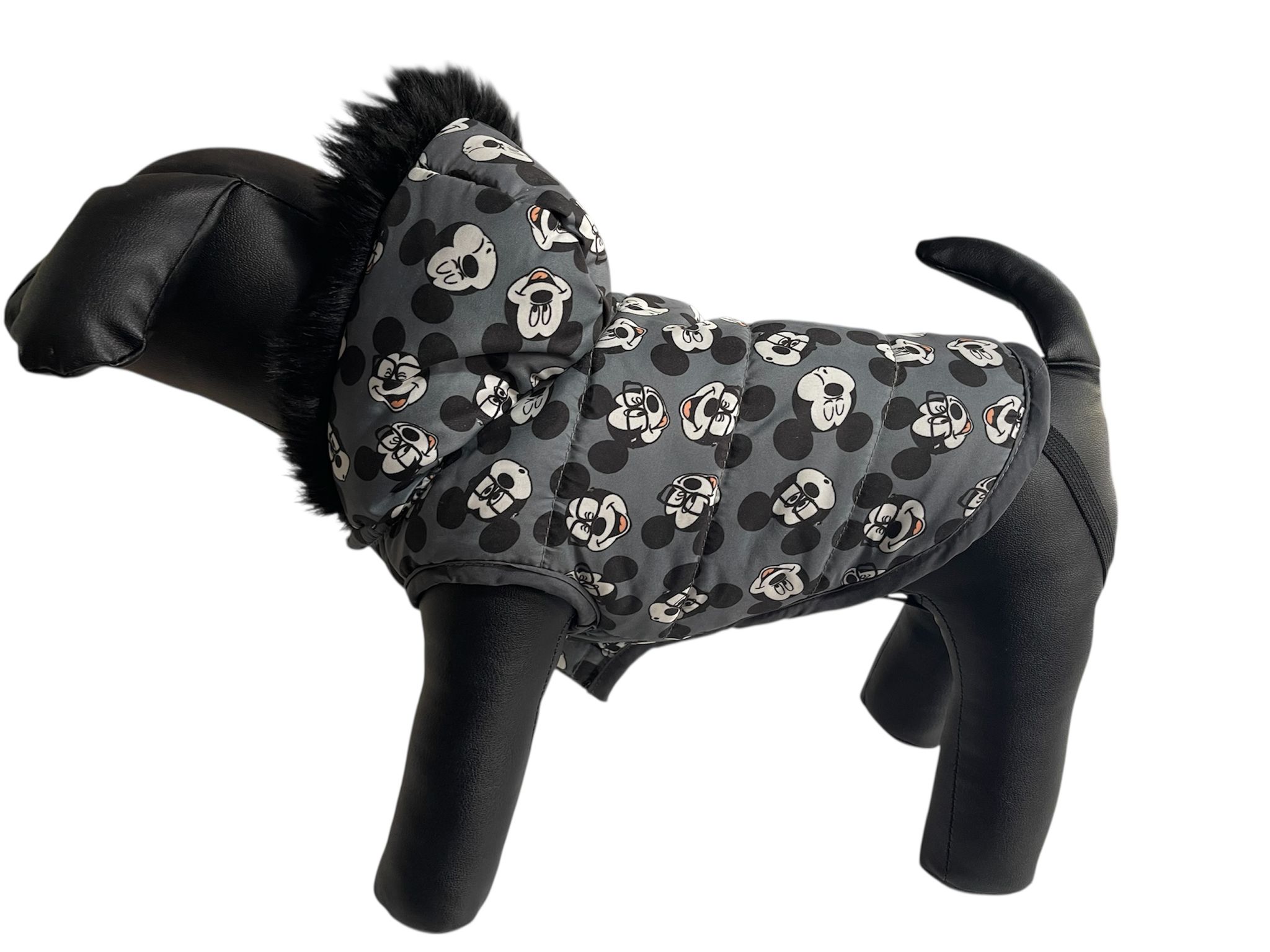 Fabricado en un material suave de color gris, destacado por un divertido estampado de caras de Mickey Mouse, ideal para mascotas con un toque encantador y juguetón,