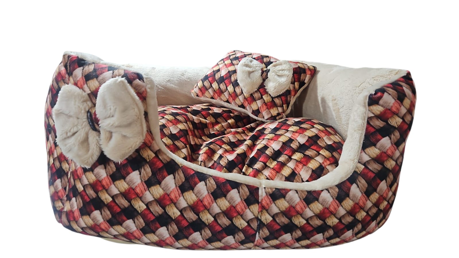 Una cama elegante y acogedora que combina diseño y confort a la perfección. Su estampado tipo trenzado en tonos cálidos —rojos, marrones y beige— aporta un toque sofisticado al hogar, mientras que su interior de peluche suave ofrece una sensación envolvente de bienestar. Incluye cojín y lazos decorativos a juego, pensados para mimar a tu mascota con estilo.