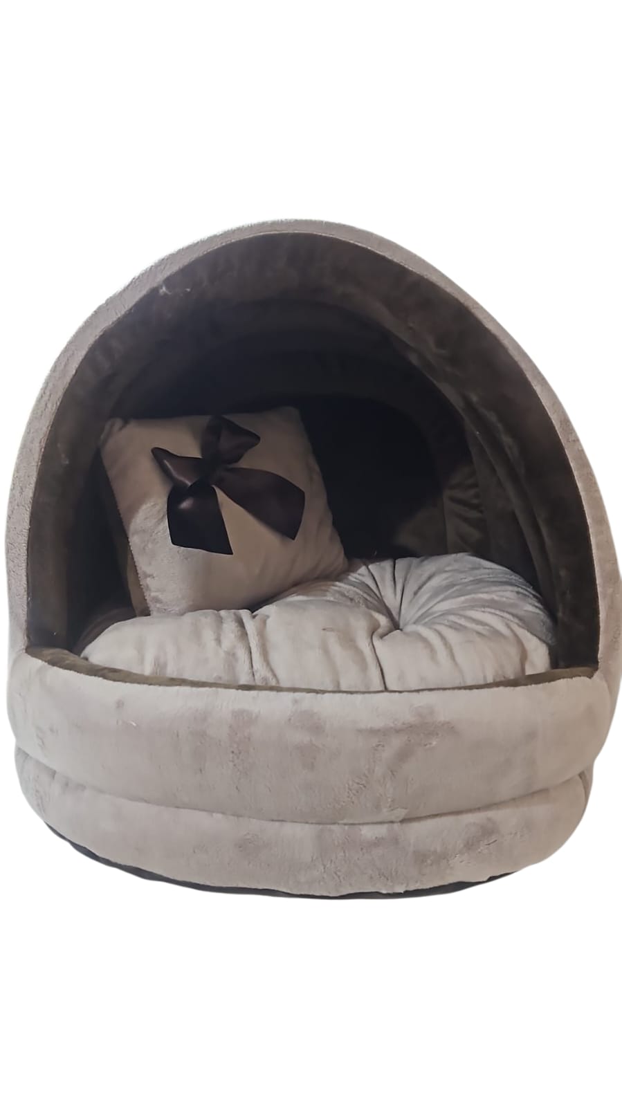 Un refugio de descanso con estilo y confort. Esta cama con diseño abovedado crea un espacio acogedor donde tu mascota se sentirá protegida y relajada. Su tapizado aterciopelado en tono beige combina suavidad y elegancia, mientras que el cojín interior con lazo decorativo añade un toque sofisticado. Ideal para perros o gatos que buscan intimidad y calidez.