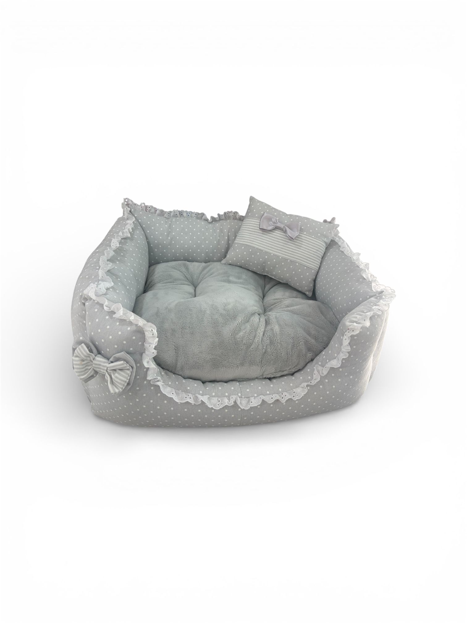 Es una cama para mascota de color gris claro con pequeños puntos blancos