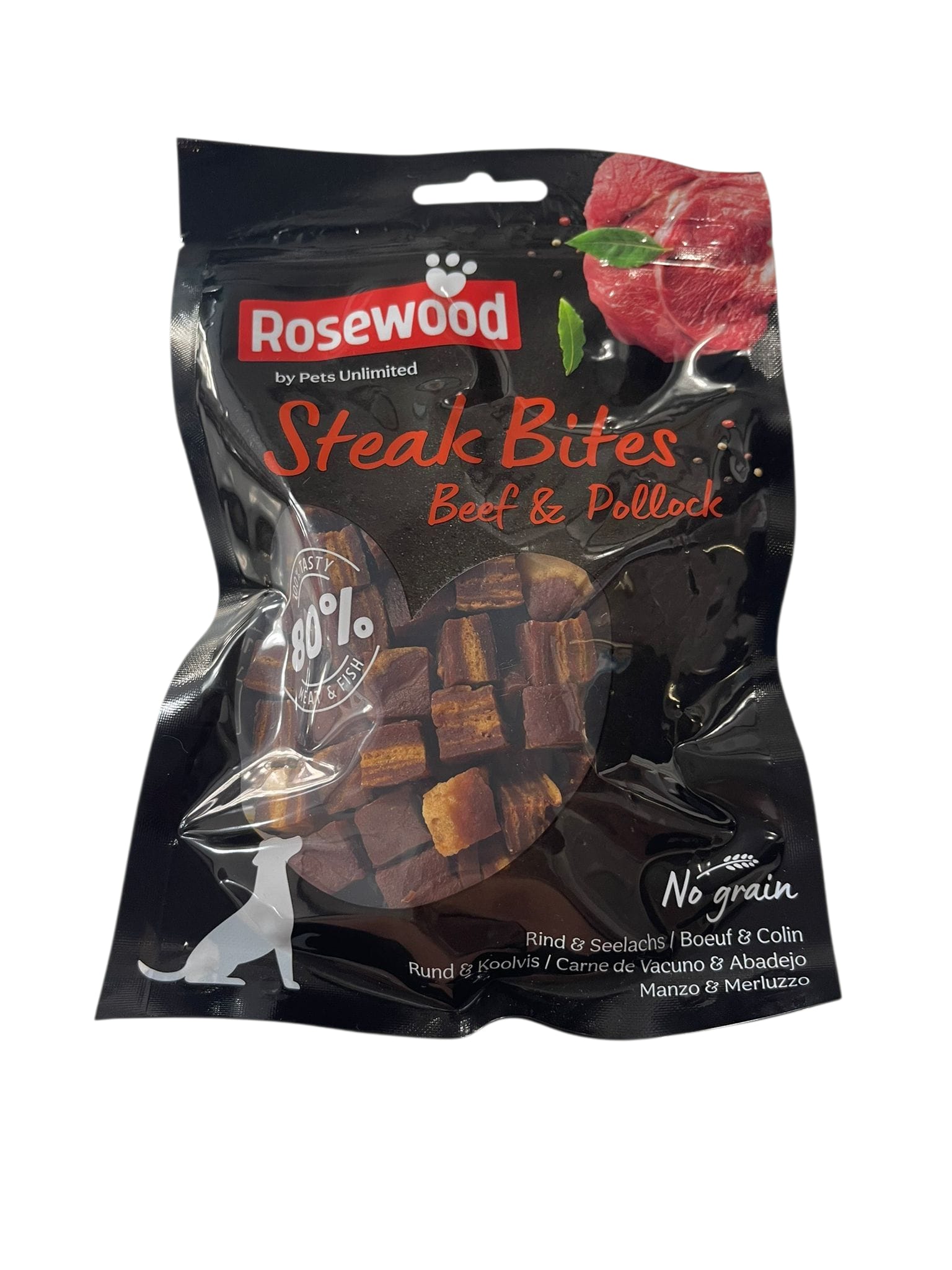 En resumen, los Rosewood Steak Bites Beef & Pollock son premios naturales, sin cereales y ricos en proteínas, elaborados con carne de vacuno y pescado blanco (abadejo), ideales como recompensa o snack saludable para perros de cualquier tamaño.