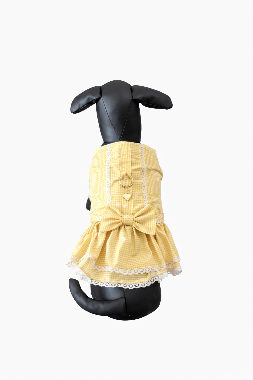 Arnés vestido para perro con diseño elegante en tono amarillo Arnés para perro con diseño tipo vestido confeccionado en un delicado tejido de cuadros en tono amarillo suave. Combina funcionalidad y estilo, incorporando un elegante lazo trasero y detalles de encaje que aportan un toque femenino y sofisticado.